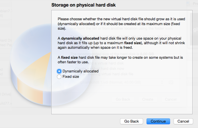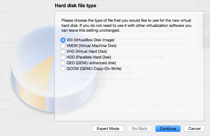 - Hard Disk file type: Use the default, VDI (VirtualBox Disk Image)