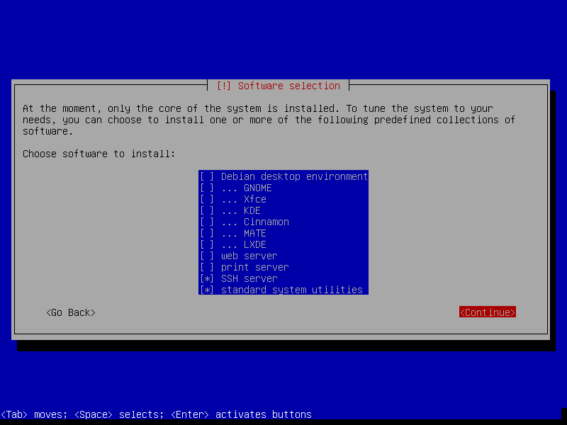 - Uncheck 'Debian Desktop Environment' and 'Print Server'